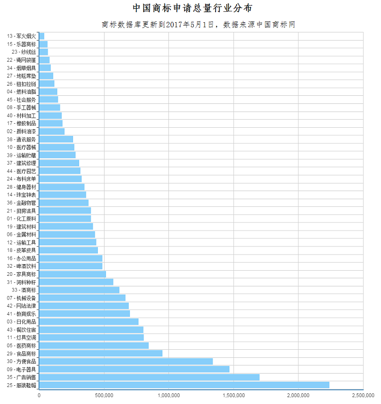 按国际相关法律,按照行业划分,商标分为45个行业,覆盖了几万个商品,包罗万象。下面统计了中国历史上所有商标的注册申请量,我们来看一下具体那些行业类别的申请量最大。