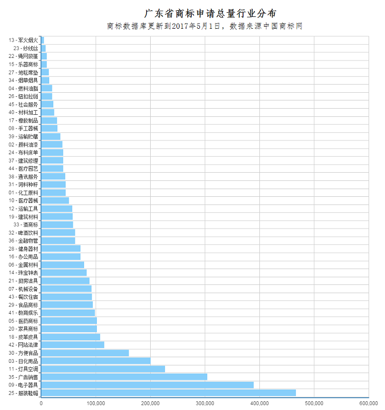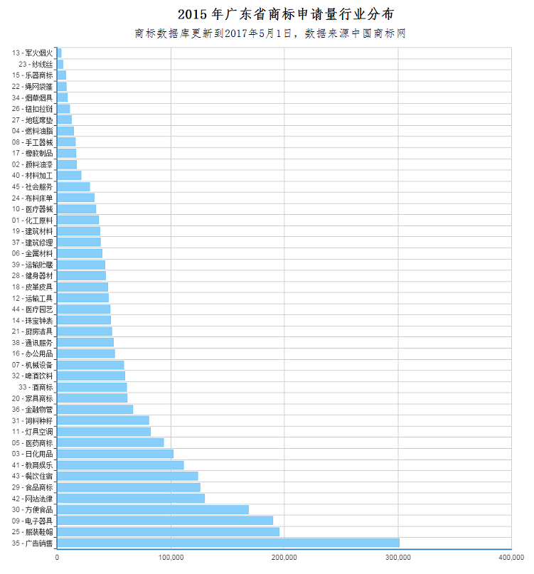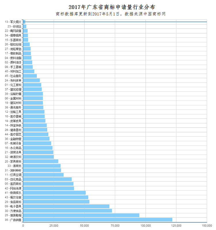 截止到2017年5月1日,2017年广东省公司申请商标量前5名的行业类别是: